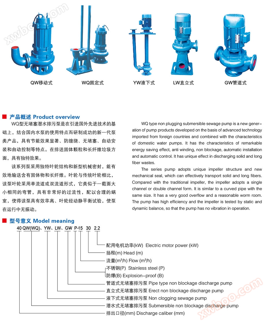 Bomba de alcantarillado sin bloqueo Qw / WQ / yw / LW / GW
